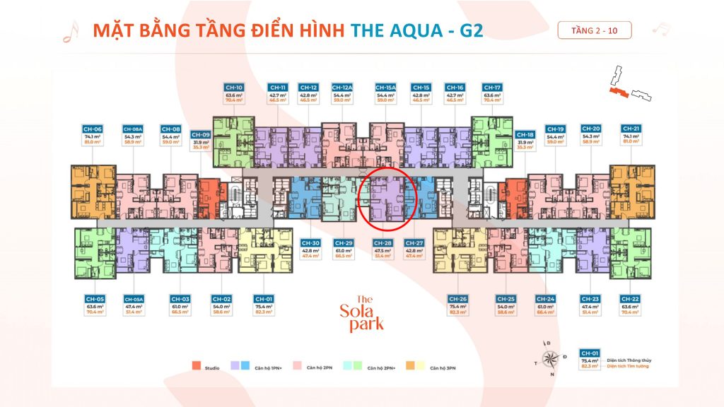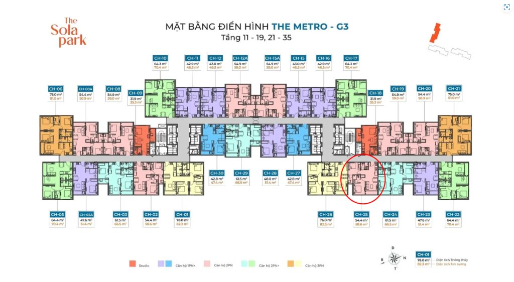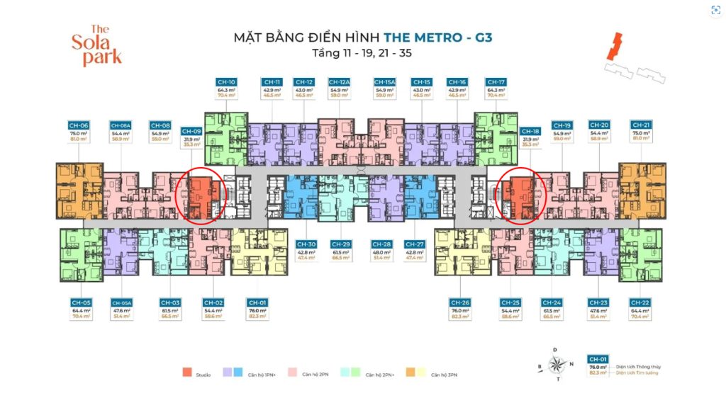 Tòa G3, 2 Căn studio, Diện tích 31.9 m2, trục số 18 và trục 09, Hướng ban công Đông Nam, hướng cửa Tây Bắc.Tòa G3, Trục 25, Căn 2 ngủ, Diện tích 54.4m2, Hướng ban công Tây Bắc, hướng cửa Đông NamTòa G2, Trục 28, Căn 1 ngủ +, Diện tích 48m2, Hướng ban công ĐN, hướng cửa TB