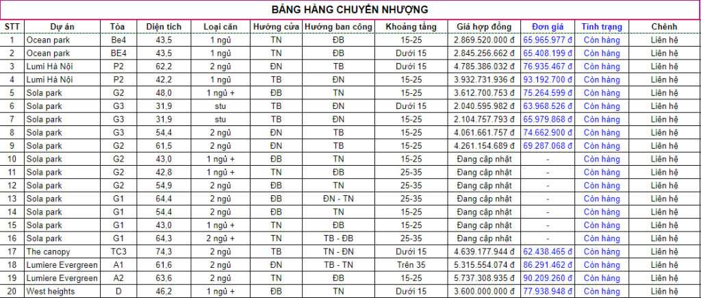 Danh sách căn chung cư tại Smart City bán chuyển nhượng bởi Thành Penthouse